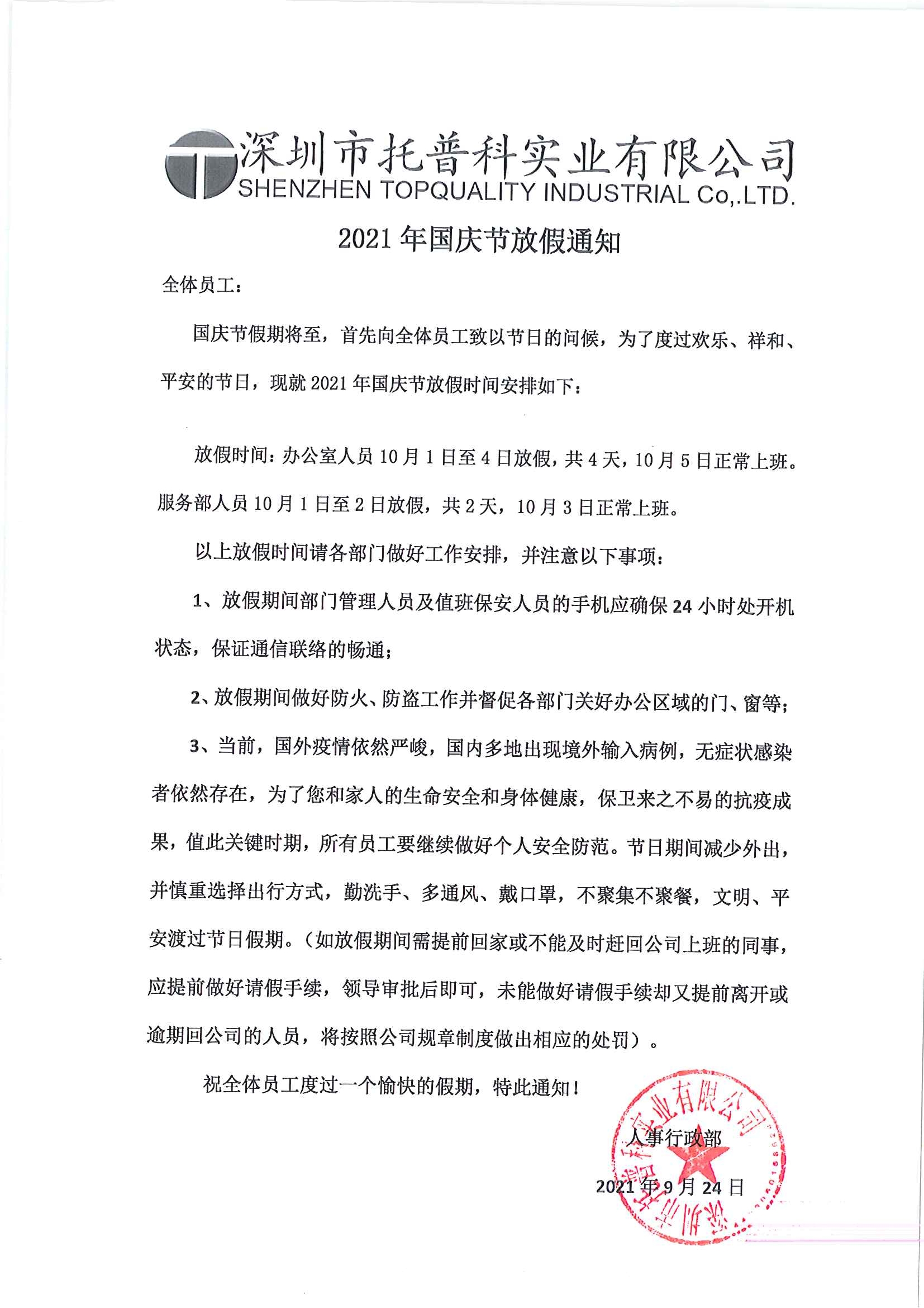 根據(jù)國務院及公司生產安排,現(xiàn)公布深圳托普科2021國慶節(jié)放假通知安排