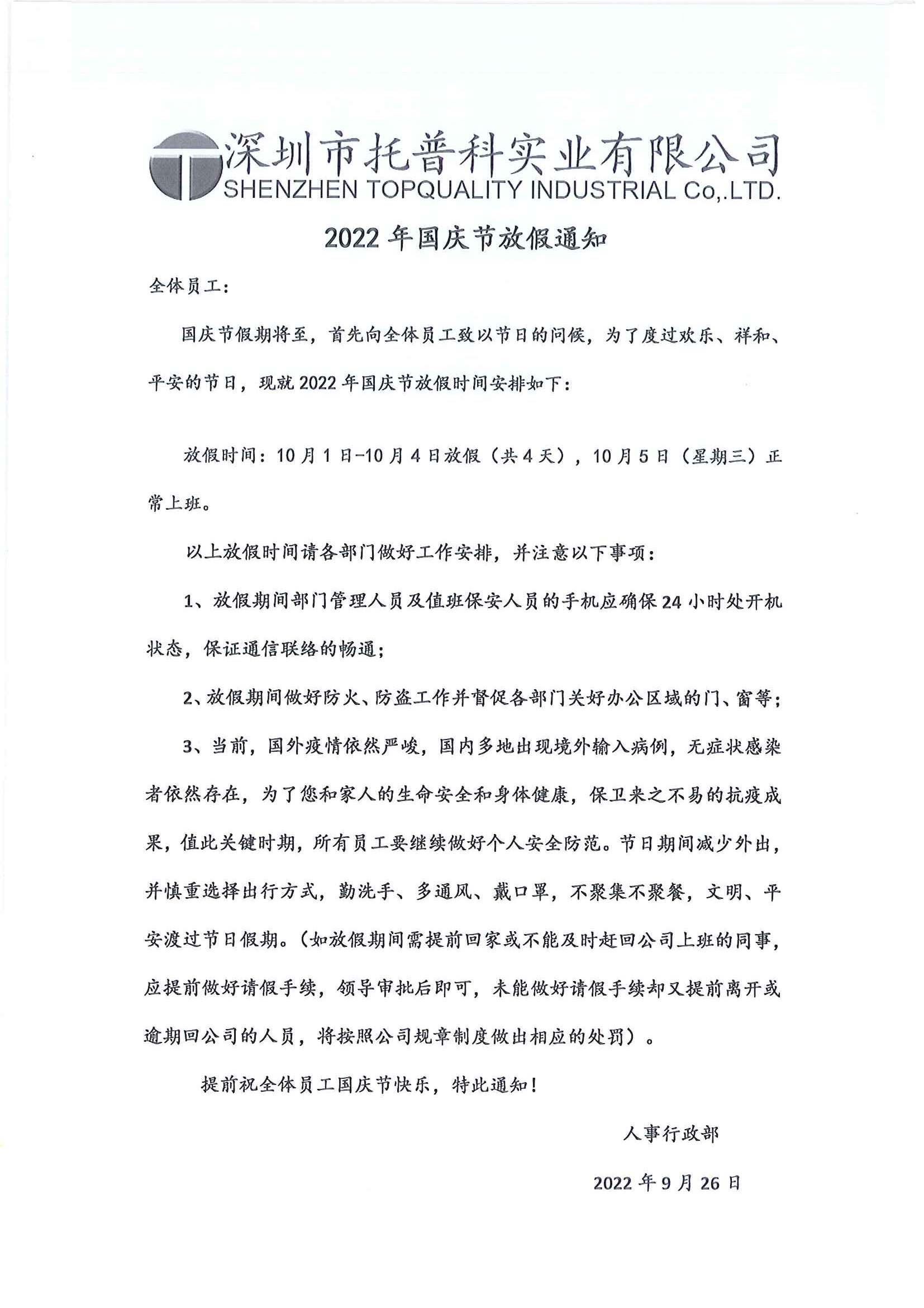 深圳托普科實業(yè)2022年國慶放假通知
