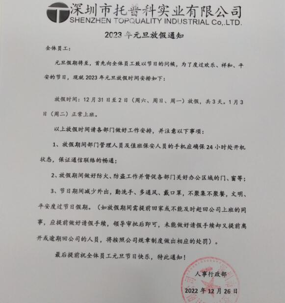 根據國務院放假規(guī)定,結合本司實際情況,2023年元旦放假公告如下: