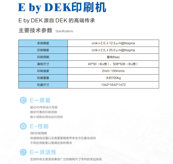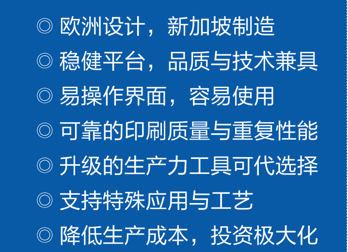 Eby DEK印刷機,歐洲設計,新加坡制造。穩(wěn)健平臺,品質(zhì)與技術兼具,易操作界面和容易使用??煽康挠∷①|(zhì)量與重復性能。