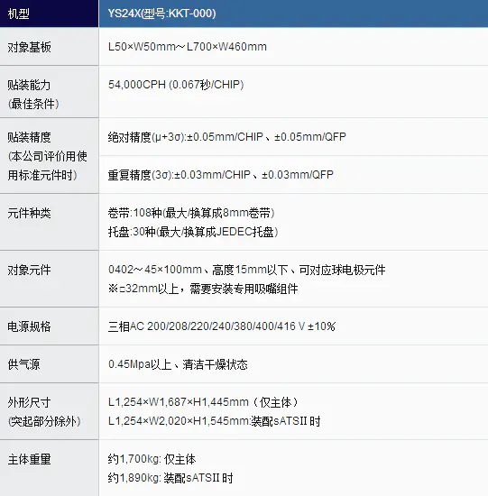YAMAHA貼片機(jī)-YS24X型產(chǎn)品概述: 54,000CPH(0.067 秒/CHIP)通用貼片機(jī)最佳的貼裝能力 sATSⅡ自動(dòng)交換式托盤 對(duì)應(yīng)供給裝置 L700×W460mm 對(duì)應(yīng)超大型基板 對(duì)應(yīng)雅馬哈雙搬運(yùn)軌道系統(tǒng) 0402~45×100mm 對(duì)應(yīng)元件 H15mm 對(duì)應(yīng)高度