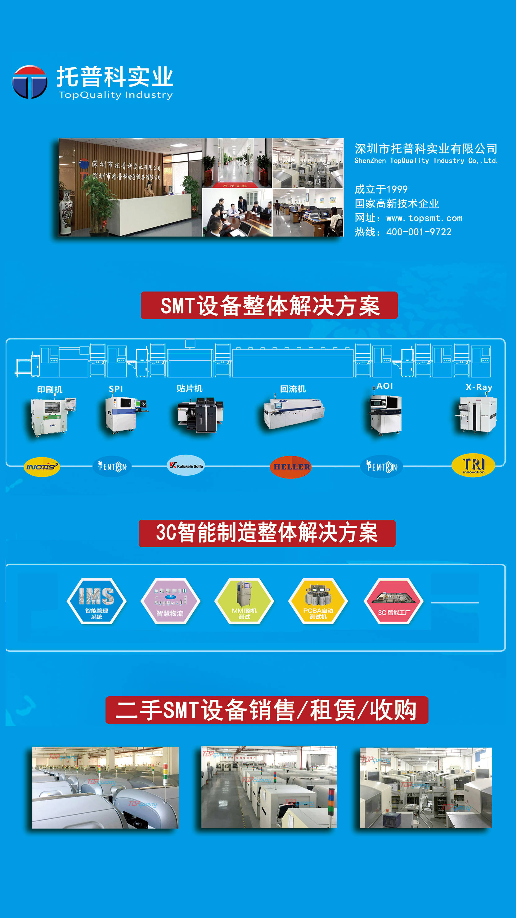 深圳市托普科實(shí)業(yè)有限公司是一家高科技術(shù)公司,專業(yè)提供二手及全新SMT設(shè)備,(貼片機(jī),回流焊,波峰焊,印刷機(jī),AOI,SPI)收銷/租賃/維修以及SMT周邊所有設(shè)備研發(fā)、生產(chǎn),銷售為一體,產(chǎn)品有:(上板機(jī)、下板機(jī)、接駁臺(tái)、平行移載機(jī)、雙軌機(jī)、跌板機(jī)、真空吸板機(jī)、緩存機(jī)、NG/OK收板機(jī)、印刷機(jī)、及各類工業(yè)控制系統(tǒng)開發(fā),配件銷售)提供一站式SMT貼裝解決方案。